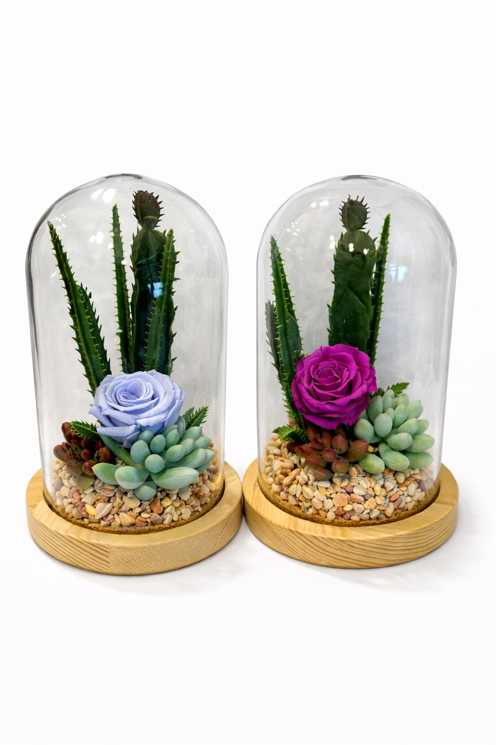 Išskirtinė rožės ir žalumos kompozicija po stiklu – dovana, kuri išlieka ilgai ir nesuvysta.