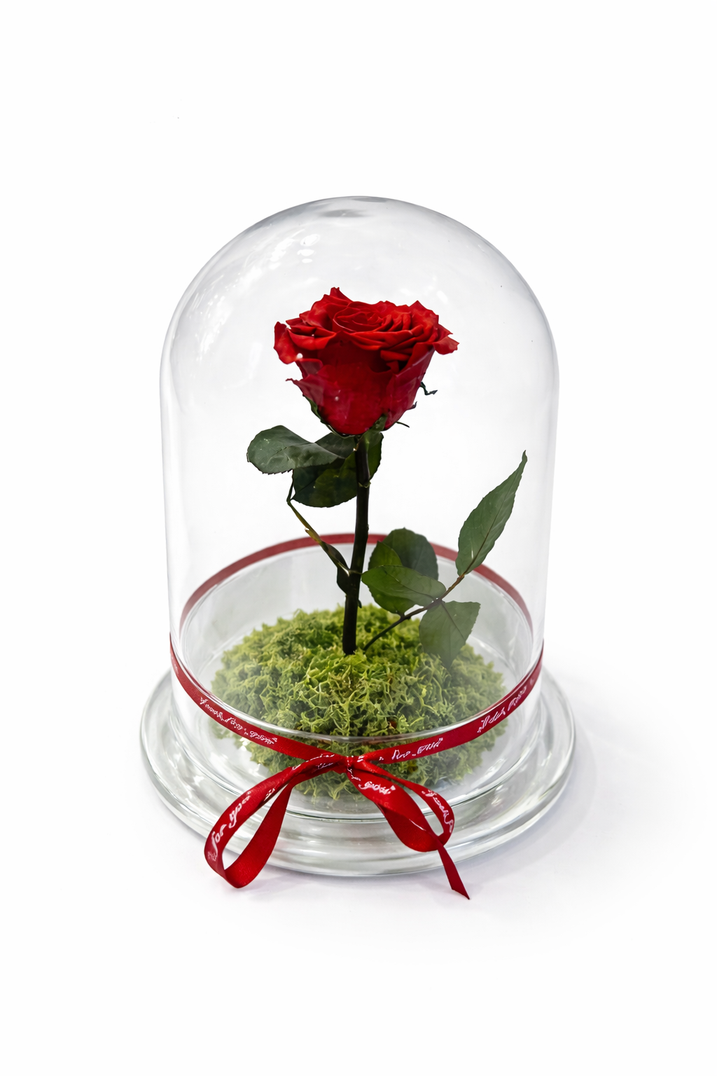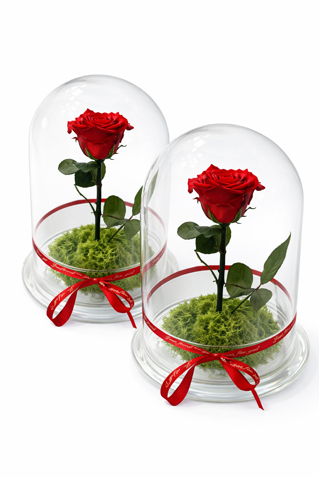 Ši elegantiška kompozicija su stabilizuota miegančia rože stiklo gaubte – subtilus ir ilgaamžis grožio simbolis. Ryški raudona rožė derinama su šviežiai atrodančia samanų baze, kuri suteikia natūralumo ir kontrasto. Stiklinis gaubtas saugo rožę, leidžiant ilgai mėgautis jos grožiu be jokios priežiūros.